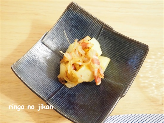 玉ねぎとベーコンを炒めて、チンしたジャガイモを加えて、粉末コンソメと塩少々で味付けしてます。(おーくんがコショウ苦手なので使っていませんが、コショウ振っても美味しいと思う)