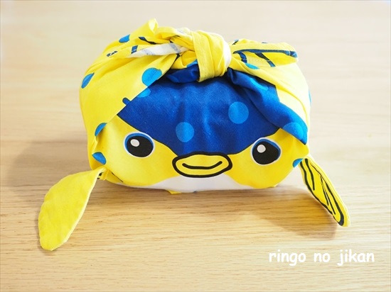 おーくんのお弁当箱はさかなクンバンダナで包んで完成です!