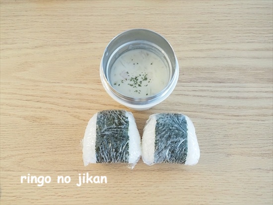クラムチャウダー(前日残り)とおにぎり2つ🍙🍙